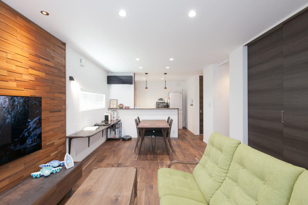 デザインウォールと同系色の床材で木のぬくもりあふれた心地よいLDK。統一感のある家具や小物でおしゃれな空間に仕上がっています。